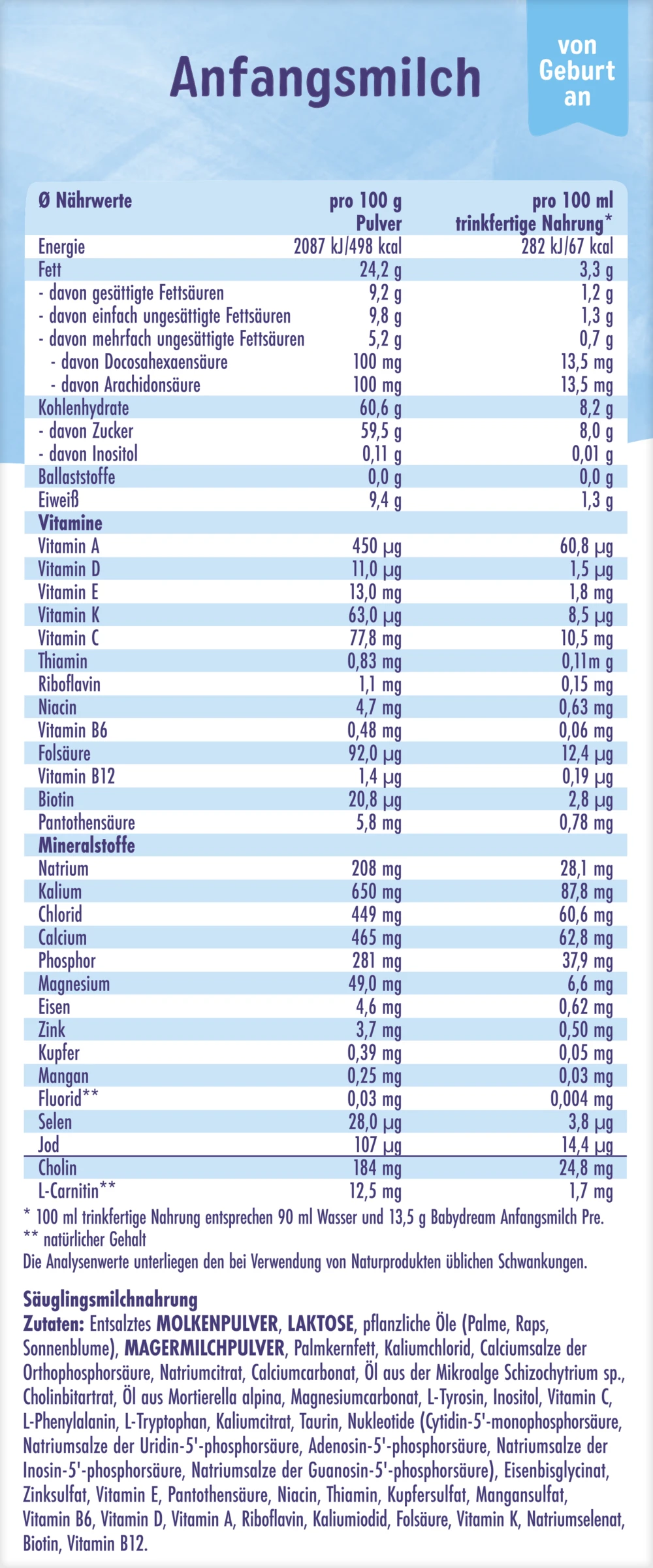 Entsalztes MOLKENPULVER, LAKTOSE, pflanzliche Öle (Palme, Raps, Sonnenblume), MAGERMILCHPULVER, Palmkernfett, Kaliumchlorid, Calciumsalze der Orthophosphorsäure, Natriumcitrat, Calciumcarbonat, Öl aus der Mikroalge Schizochytrium sp., Cholinbitartrat, Öl aus Mortierella alpina, Magnesiumcarbonat, L-Tyrosin, Inositol, Vitamin C, L-Phenylalanin, L-Tryptophan, Kaliumcitrat, Taurin, Nukleotide (Cytidin-5′-monophosphorsäure, Natriumsalze der Uridin-5′-phosphorsäure, Adenosin-5′-phosphorsäure, Natriumsalze der Inosin-5′-phosphorsäure, Natriumsalze der Guanosin-5′-phosphorsäure), Eisenbisglycinat, Zinksulfat, Vitamin E, Pantothensäure, Niacin, Thiamin, Kupfersulfat, Mangansulfat, Vitamin B6, Vitamin D, Vitamin A, Riboflavin, Kaliumiodid, Folsäure, Vitamin K, Natriumselenat, Biotin, Vitamin B12.