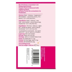 Äpfel*, Hibiskus*, Hagebutten*, Steviablätter*, natürliches Aroma, Himbeeren* 0,5% (EU-/Nicht-EU). *aus ökologischer Landwirtschaft