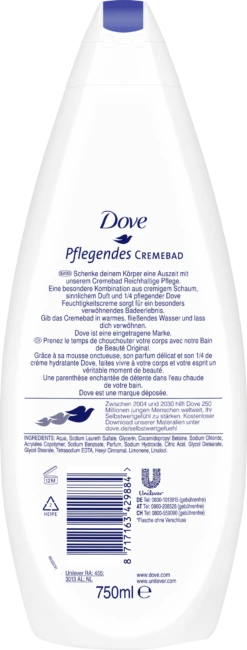 Mit dem feuchtigkeitsspendenden Schaumbad ist es ganz einfach, der Haut die Pflege zu geben, die sie braucht. Dove Badezusatz Reichhaltiges Cremebad verwandelt die tägliche Hautpflege in einen Moment der Entspannung, das gewöhnliche Baden in ein himmlisch verwöhnendes Bad. Die sanfte Formel des Pflegeschaumbads mit ¼ Feuchtigkeitscreme verleiht ein geschmeidiges, weiches Hautgefühl. Es bildet einen reichhaltigen, samtigen Schaum, der die Haut mit Feuchtigkeit versorgt.