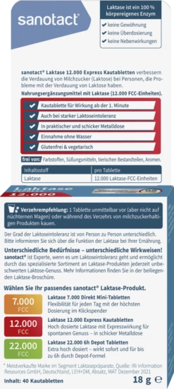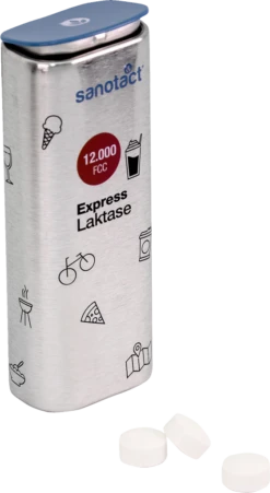 Die sanotact Express Laktase 12.000 Kautabletten verbessern die Verdauung von Milchzucker (Laktose) bei Personen, die Probleme mit der Verdauung von Laktose haben (Laktoseintoleranz). Das Besondere: Wirkt extra schnell und sicher durch die hohe Dosierung, die dank der Kautablette ab der 1. Minute komplett freigegeben wird. Besonders praktisch in der schicken Metalldose.