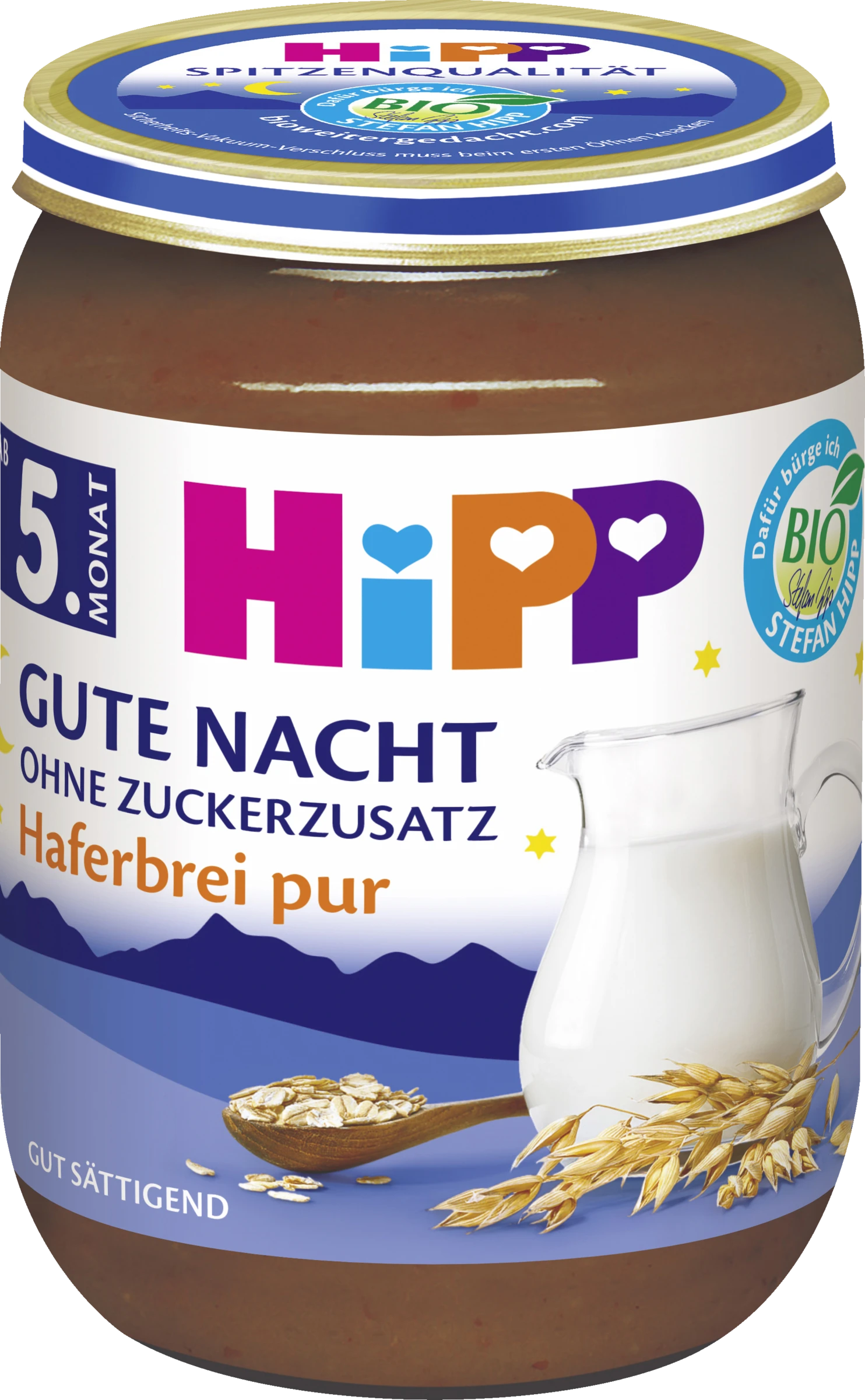 HiPP Gute Nacht Haferbrei pur ist ein vollwertiger Abendbrei im Glas aus babygerechter Milchzubereitung und Getreide – ganz ohne Zuckerzusatz. Die Produkte sättigen besonders gut und sind somit die ideale Abendmahlzeit vor dem zu Bett gehen. Mit Vitamin A, B1, D und Calcium.