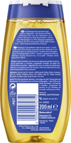 Entdecken Sie ein geschmeidiges Hautgefühl mit dem reichhalitgen NIVEA Dusch-Öl. Spüren Sie, wie das verwöhnende Duschöl mit 55% natürlichen Ölen auch trockene Haut intensiv pflegt. In Verbindung mit Wasser verwandelt sich das Duschöl in einen samtweichen Schaum und entfaltet einen warmen Duft. Das Duschöl tut nicht nur Ihrer Haut, sondern auch der Umwelt etwas Gutes: Die Formel enthält kein Mikroplastik und die Flasche besteht zu 96% aus Recycling-Material, abgesehen von der Verschlusskappe und der Label. Für ein geschmeidiges Hautgefühl: NIVEA Reichhaltig Pflegendes Duschöl.