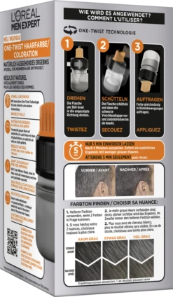 Die One-Twist Haarfarbe in Hellbraun von L’Oréal Paris Men Expert ist eine sanfte Haar-Coloration speziell für Männerhaar. Sie verleiht ein natürliches Aussehen und deckt graue Haare zu 100 % ab.