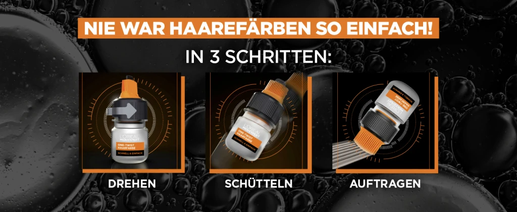 Die One-Twist Haarfarbe Hellbraun von L’Oréal Paris Men Expert besticht mit einem patentierten und einfachen Anwendungssystem. So wird der Behälter vor Beginn der Anwendung erst aufgedreht und anschließend kräftig geschüttelt, damit sich die Farbpigmente gründlich vermischen. Nun kann die Farbe mithilfe des integrierten Applikators nach und nach auf das Haar aufgetragen werden, um alle Partien gründlich mit Coloration zu versehen. Anschließend die Haarfarbe für die auf der Packungsanweisung vermerkte Dauer einwirken lassen. Danach gründlich mit klarem Wasser ausspülen. Die L’Oréal Paris Men Expert One-Twist Haarfarbe hält bis zu 6 Wochen und kann je nach Bedarf verwendet werden.