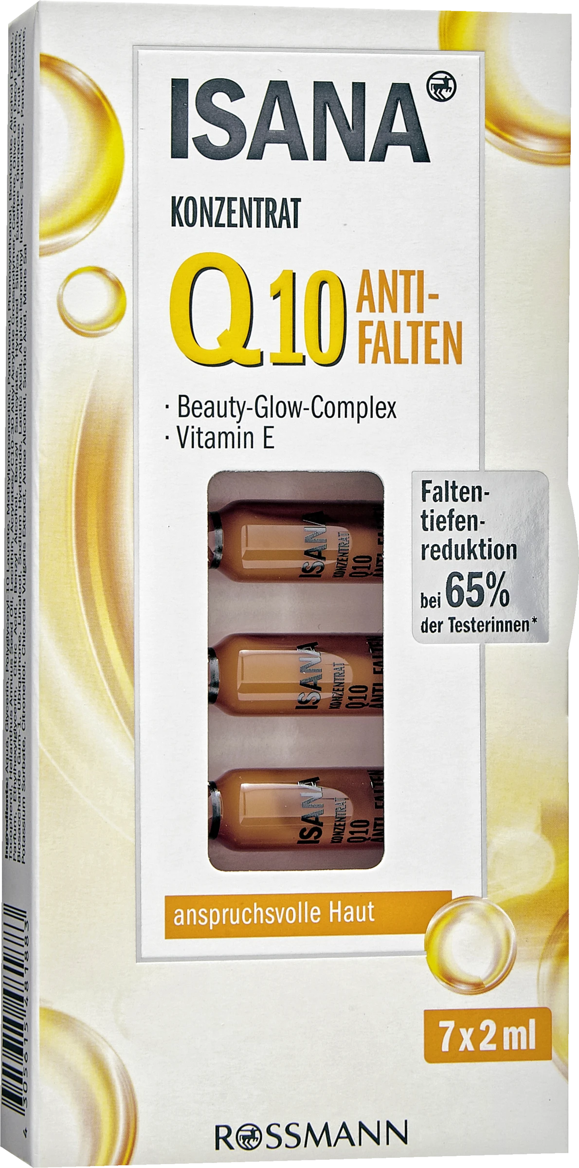 Das ISANA Q10 Anti-Falten Konzentrat verfeinert das Mikrorelief der Haut und schützt sie mit antioxidativer Powerformel*** Für glattere Haut und fühlbar mehr Geschmeidigkeit. WIRKUNG: Die Pflegeformel mit Petid-Komplex bietet der Haut Schutz gegen freie Radikale***. Liposomal verkapseltes Q10 hat antioxidative Eigenschaften und ist ein Energielieferant der Zellen. Biosaccharide und pflanzliches Glycerin versorgen die Haut mit Feuchtigkeit, während Koffein anregende Eigenschaften hat und so Zeichen von Müdigkeit mildern kann. Ergebnis: Das ISANA Q10 Anti-Falten Power Konzentrat reduziert die Faltentiefe nachweislich.*** bei 90% der Testerinnen wurde nach 28 Tagen ein positiver Effekt hinsichtlich der Faltentiefe nachgewiesen.** in-vivo Studie zur Faltentiefenreduktion an 20 Probanden über eine Anwendungsdauer von 4 Wochen.*** in-vitro Studie zum RadikalschutzHautverträglichkeit: dermatologisch bestätigt. Klinisch getestet gemäß Dermatest 5-Sterne-garantie Siegel (www.5-sterne-garantie.de)