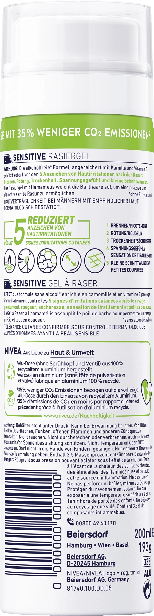 Gewünschte Menge des Rasiergels in die Hand geben. Sensitive Rasiergel auf die angefeuchtete Haut auftragen. Nach der Rasur die Reste des Gels sanft mit Wasser abwaschen.