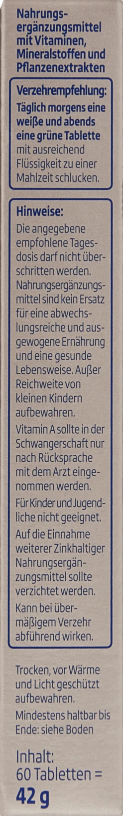 Verzehrempfehlung: Täglich morgens eine weiße und abends eine grüne Tablette mit ausreichend Flüssigkeit zu einer Mahlzeit schlucken.