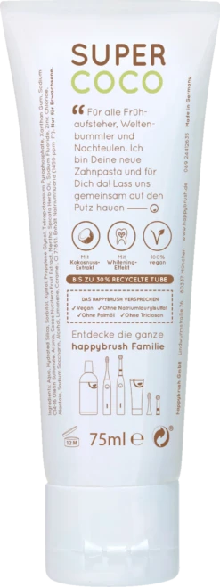 Aqua, Hydrated Silica, Sorbitol, Xylitol,Propylene Glycol, TetrapotassiumPyrophosphate, Xanthan Gum, SodiumC14-16 Olefin Sulfonate, Aroma, CocosNucifera Fruit Extract, Mentha SpicataHerb Oil, Sodium Fluoride, Zinc Chloride,Allantoin, Sodium Saccharin, Alcohol,Limonene, Caramel, CI 77891. EnthältNatriumfluorid.