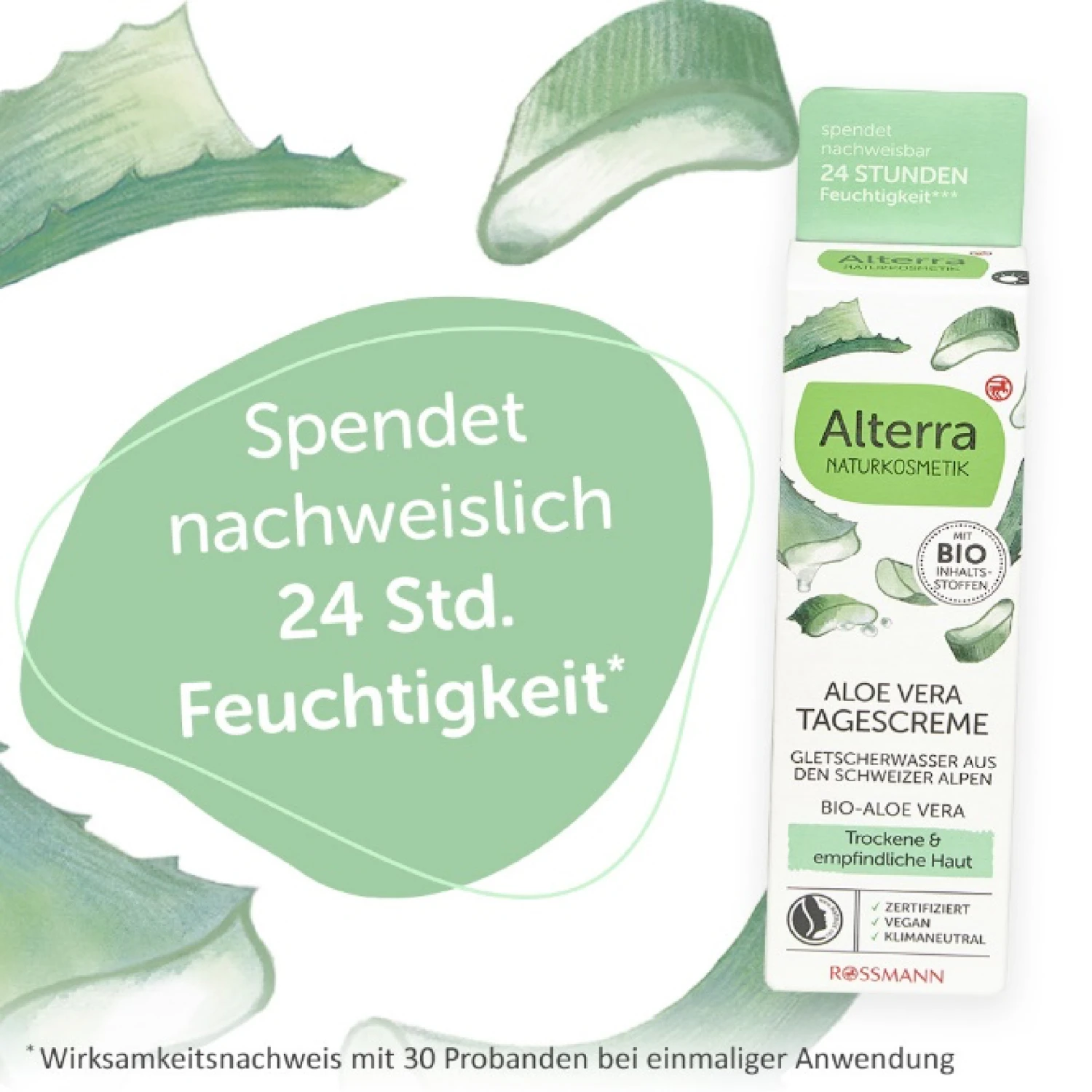 Gut gepflegt von früh bis spät: Unsere Alterra Tagescreme Aloe Vera beruhigt mit Bio-Aloe Vera auch die trockene und empfindliche Haut, hinterlässt mit Gletscherwasser ein nachhaltiges Reinheitsgefühl und pflegt mit Bio-Sheabutter Ihre Haut samtweich.